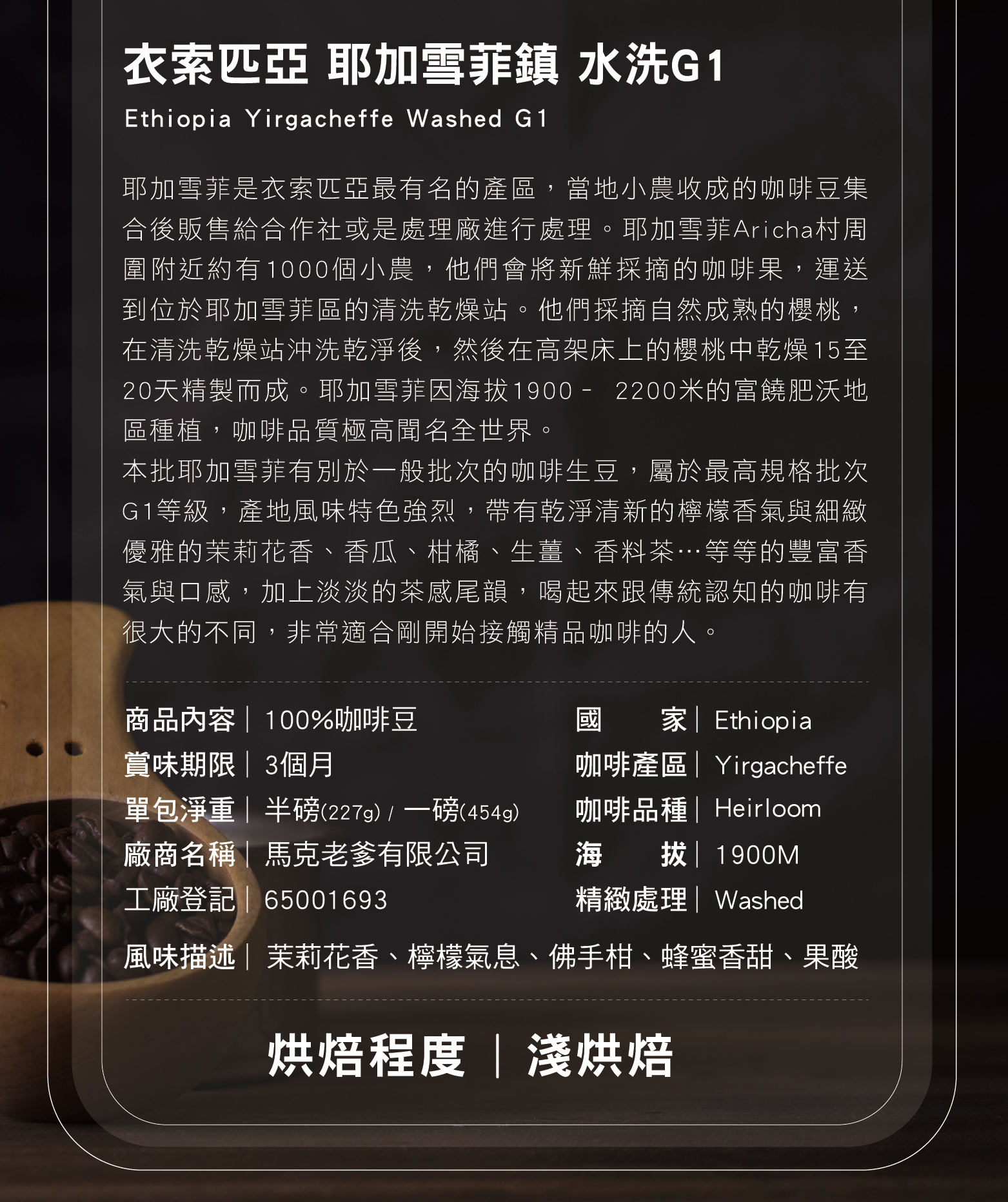 衣索匹亞 耶加雪菲 水洗G1 咖啡豆(一磅454g)