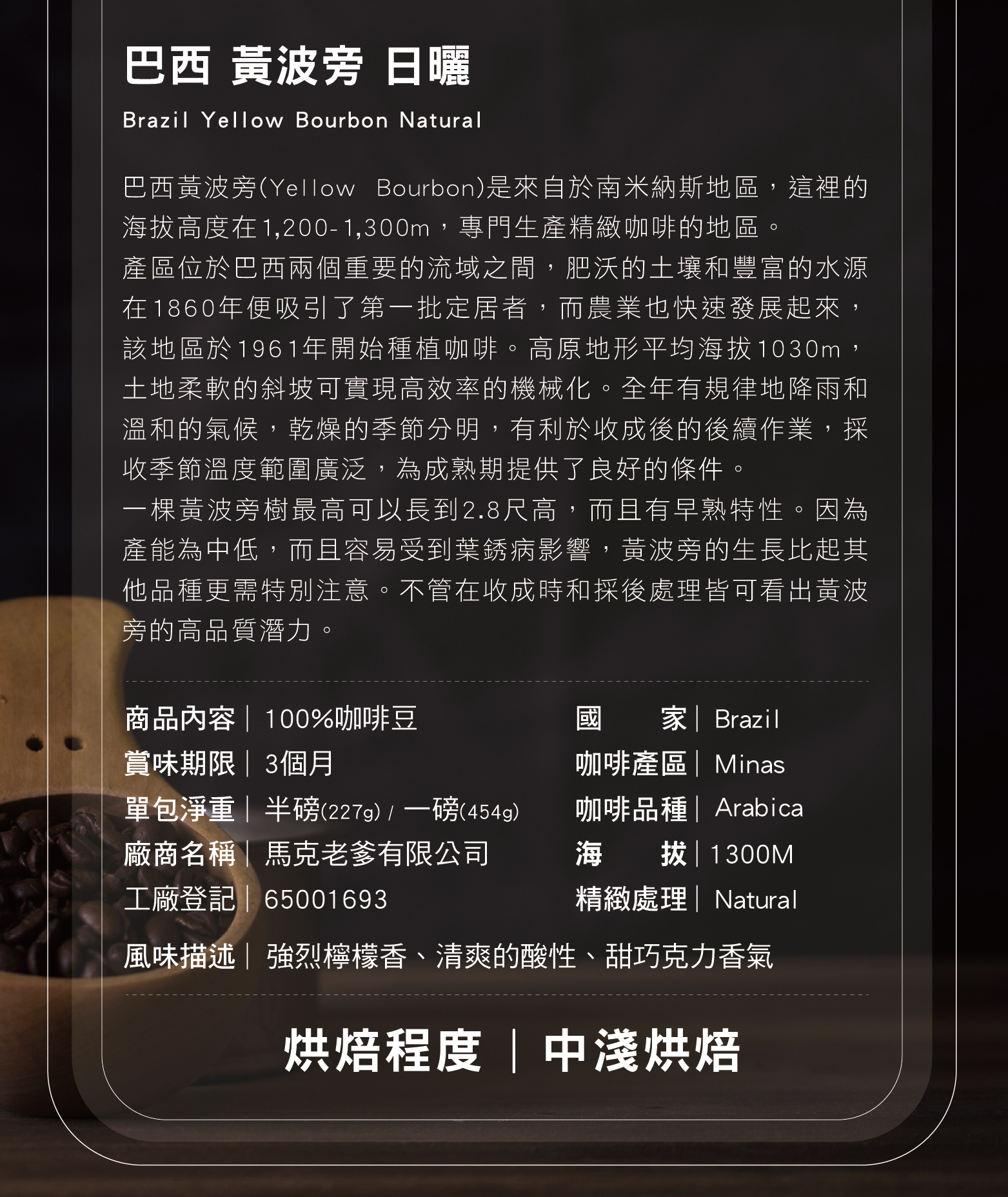 巴西 黃波旁 日曬 咖啡豆 (半磅227g)