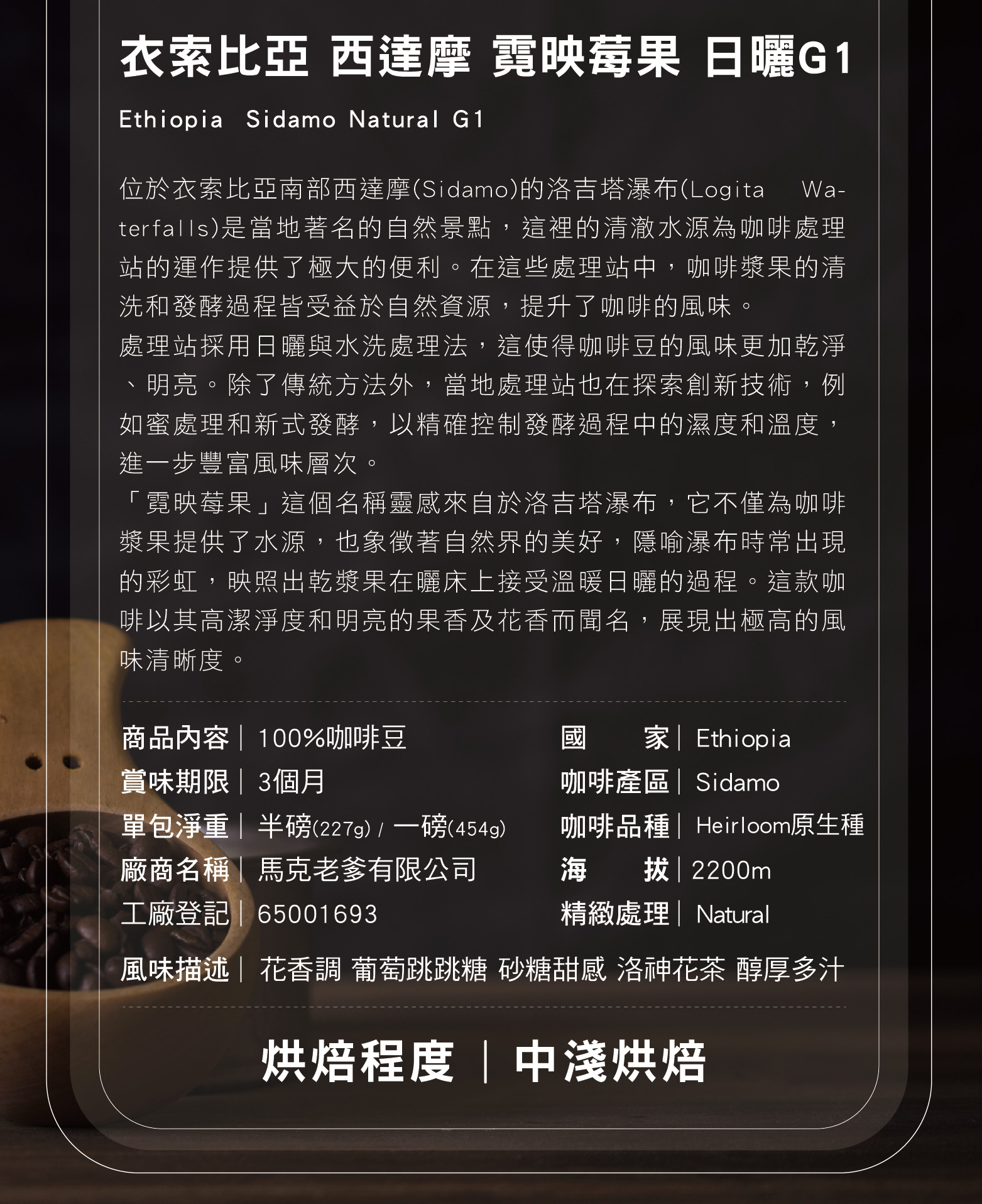 衣索比亞 西達摩 霓映莓果 日曬 G1 咖啡豆(半磅227g)