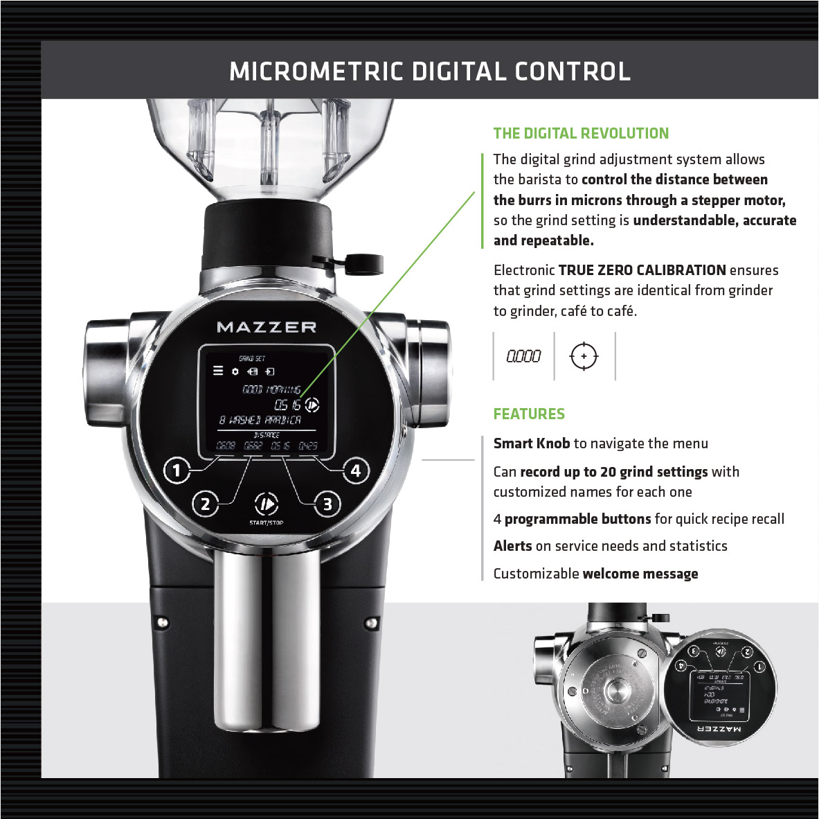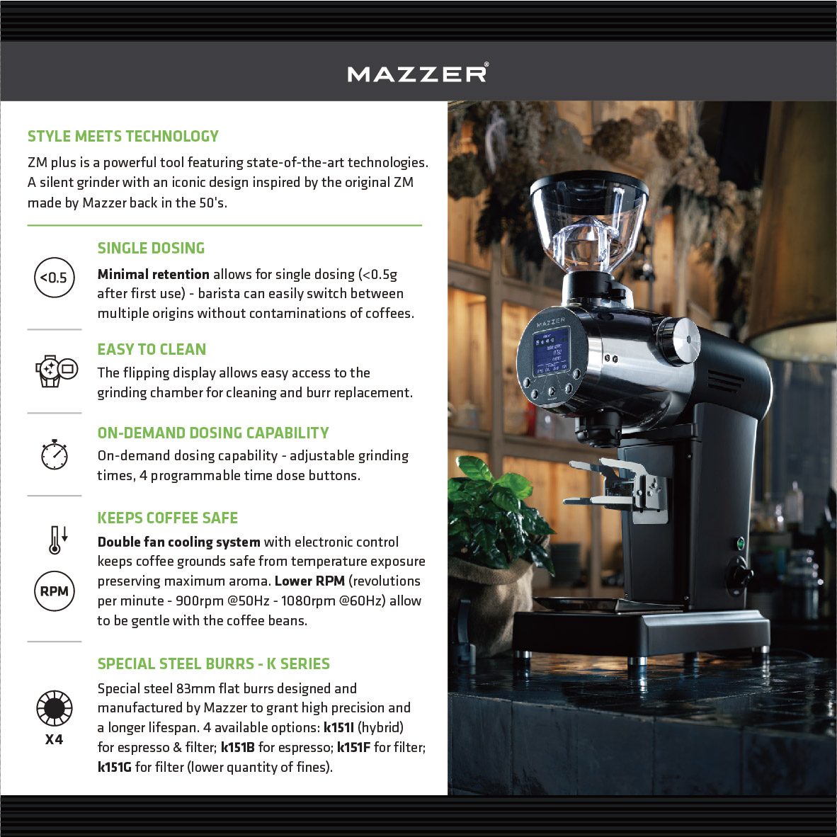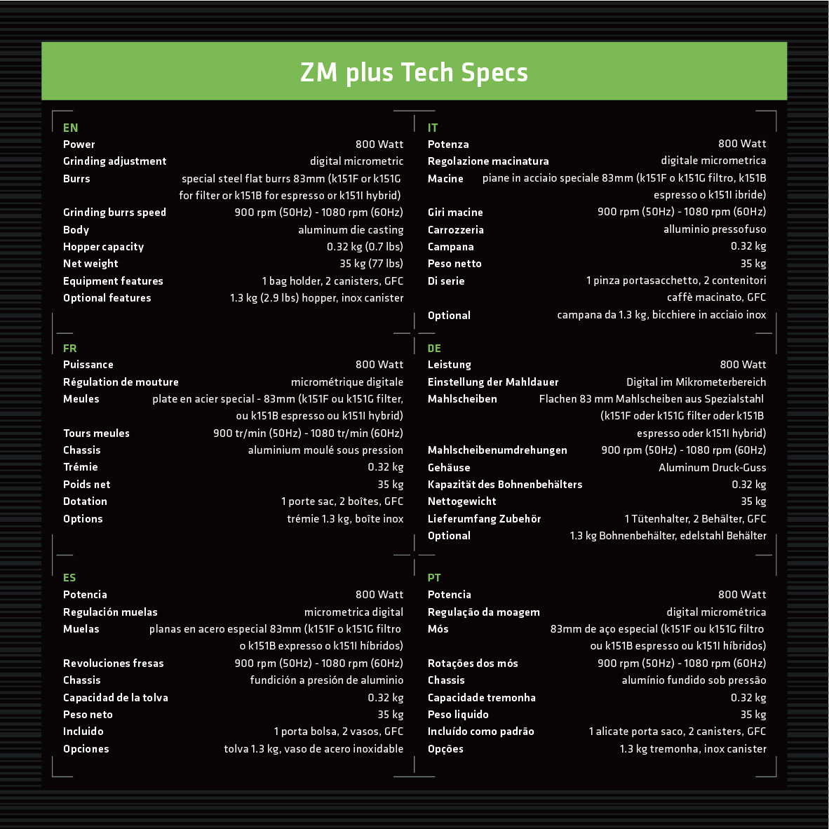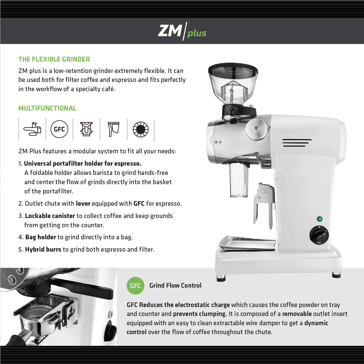 ZM Plus 擁有 digital ZM 磨豆機的所有功能,加上利於濃縮咖啡及手沖咖啡研磨的特殊裝置,使其成為精品咖啡最強大、靈活的工具。 出粉口多功能的設計,包括了義式濃縮咖啡手柄的可調式通用支架,以及手沖咖啡時需要的快速接粉罐和咖啡袋支架。其數位研磨微調系統,讓咖啡師可精準地以微米(mm)為單位控制刀盤間的距離,提供準確、簡易、並且能夠反覆操作的研磨設定。